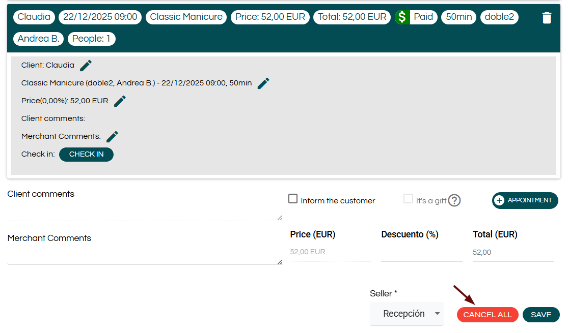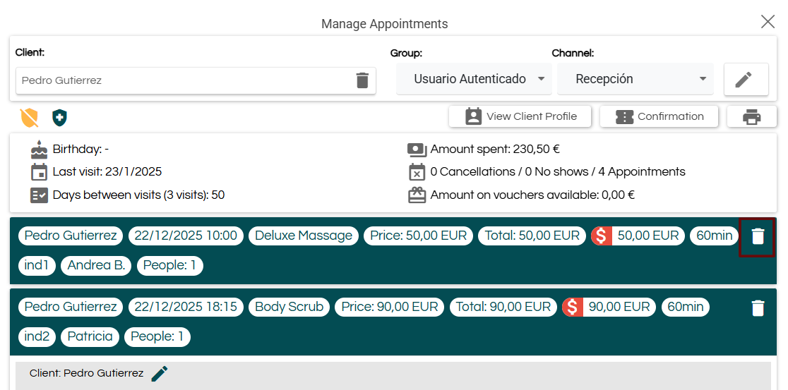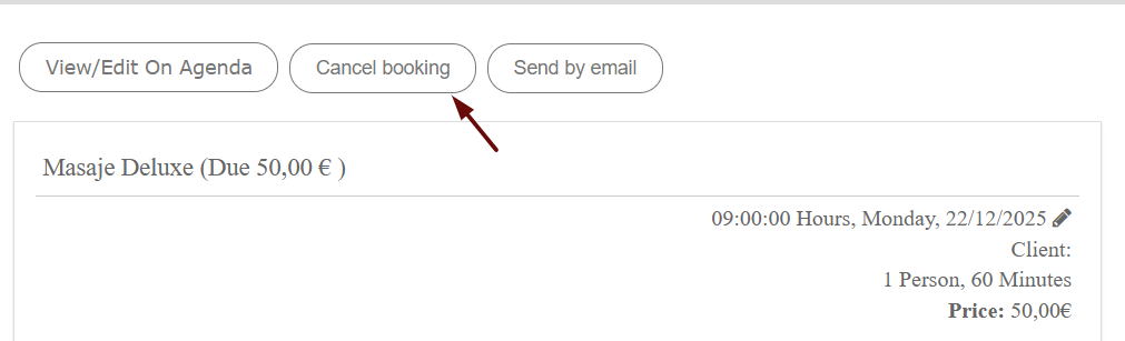 If the booking contains multiple appointments, you can cancel only one of them by clicking the trash icon next to the corresponding appointment.