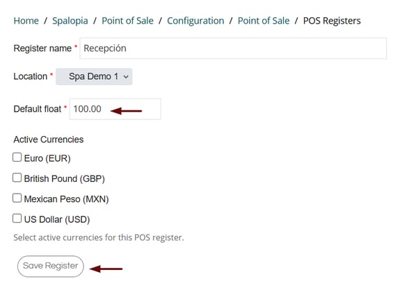✉️ Support: If your centre works with more than one currency (British pound – GBP, Mexican peso – MXN, US dollar – USD, etc.) and you would like to configure this in the Point of Sale, write to soporte@spalopia.com so we can explain how to set it up correctly.