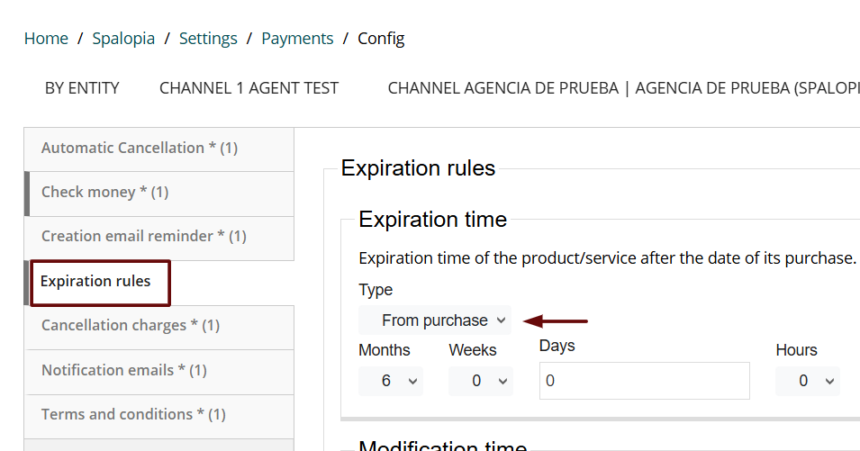 Settings > Payments > Config > Gift Vouchers > Expiration rules