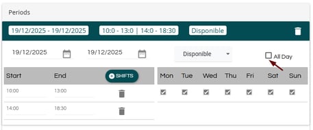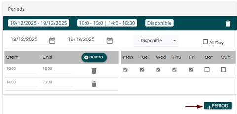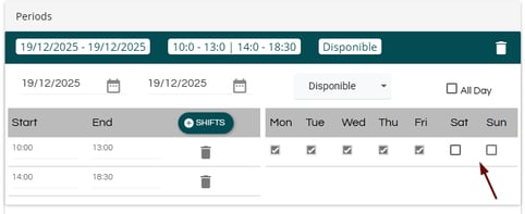 ⚠️ Warning: It is not possible to combine availability and blocking on the same day. If you need to partially limit a day, you must configure only the available time slot.