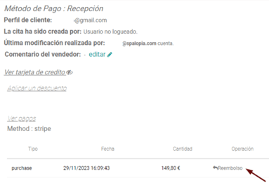 Si la cita se ha creado de forma manual en la Agenda no dispondrás de datos de la tarjeta del cliente, por lo que esta opción la utilizarías en el supuesto de que el cliente abone de forma directa los gastos de cancelación.