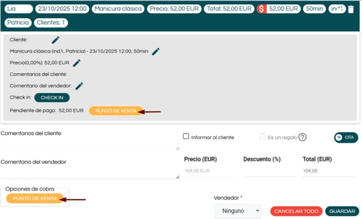 💡 Recuerda que el primer botón te permite enviar únicamente la cita seleccionada al Punto de venta, mientras que el segundo transfiere todas las citas vinculadas al mismo localizador (útil si la reserva incluye varias citas).