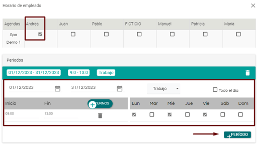 6. Puedes usar el botón +Período si necesitas añadir un horario diferente para las mismas personas, pero en otro rango de fechas.