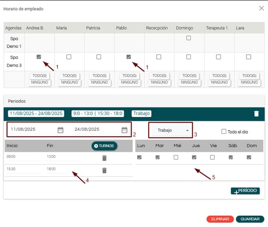 6. Puedes usar el botón +Período si necesitas añadir un horario diferente para las mismas personas, pero en otro rango de fechas.