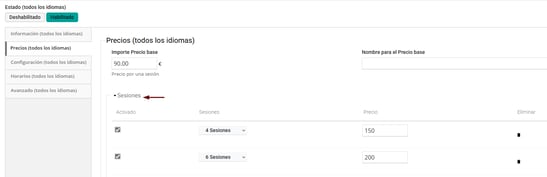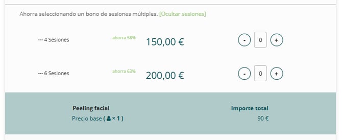 Si deseas ofrecer a tus clientes la opción de adquirir un bono de varias sesiones, puedes configurarlo fácilmente desde: Gestionar > Tratamientos > Crear/Editar el servicio correspondiente > Precios > Sesiones.
