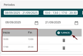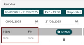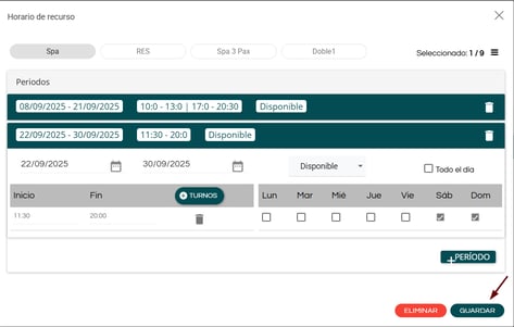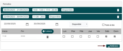 7. Si necesitas añadir otro rango de fechas u horarios a la misma selección de recursos, haz clic en + Período.