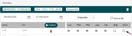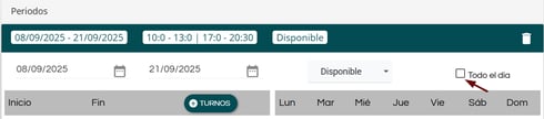 ⚠️ Solo puedes asignar un tipo de horario por día (disponibilidad o bloqueo). Es decir, no se puede cargar la mañana con disponibilidad y la tarde con bloqueo. Para este caso, se debe cargar únicamente el turno disponible.