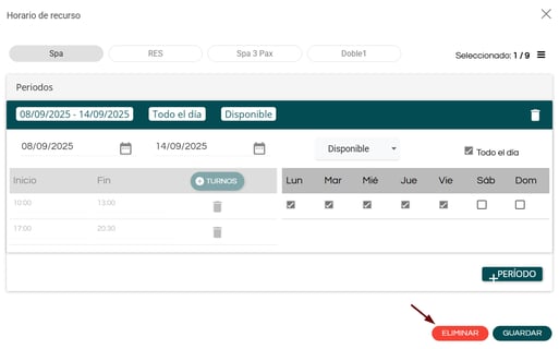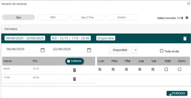 💬 Por ejemplo: el recurso Spa, del 09/06 al 22/06, estará disponible de 9 h a 12:15 h y de 17 h a 23:30 h, todos los días excepto sábados y domingos.