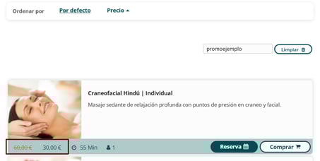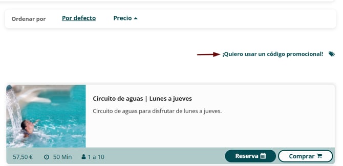 Si tienes activada la opción de códigos promocionales en la configuración de tu spa, el Motor de reservas mostrará un campo específico para introducirlos.