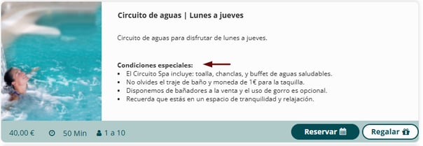 💬 Por ejemplo: si deseas ampliar los requisitos de acceso al Circuito de aguas, estas condiciones se mostrarán después de la descripción del servicio.