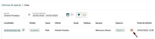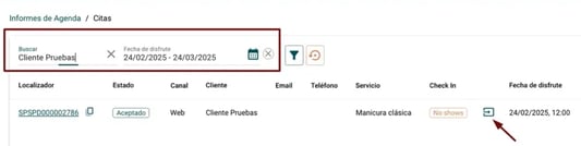 • Busca la cita usando el filtro de "Fecha de disfrute" o el nombre del cliente en la barra de búsqueda.
