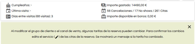 Si se realiza un cambio de grupo de cliente o canal de venta que conlleva una tarifa diferente, el sistema mostrará dos alertas: