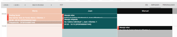 💬 Por ejemplo, en la vista por empleado veremos las citas con el color configurado en el profesional, y en la vista por recurso con el asociado a la cabina donde se realizará la cita.