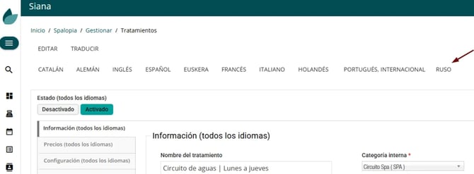 Cuando se crea un servicio desde Gestionar > Tratamientos o Paquetes, este se publica automáticamente en todos los idiomas activos en el back office.