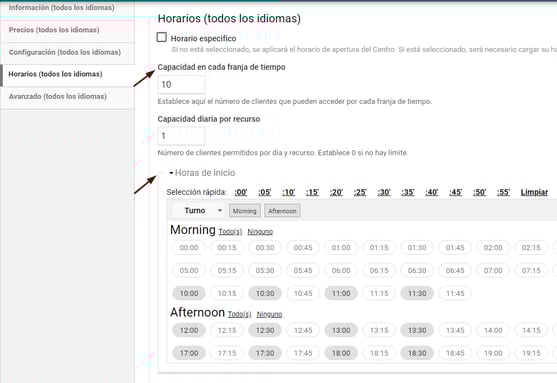 ⚠️ Si estableces esta capacidad en franja de tiempo, debes seleccionar también las Horas de inicio; de lo contrario, el sistema no sabrá cuándo aplicar el límite y no mostrará disponibilidad en ningún horario.
