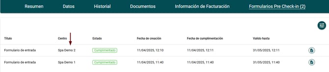 - Si tu centro forma parte de una cadena, podrás ver si el cliente ha rellenado el Pre check-in online en tu centro o en otro, sin que esto elimine respuestas previas.