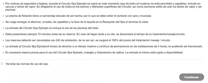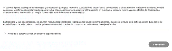 Si el cliente no lo cumplimenta antes de su visita, podrá hacerlo directamente en el centro, antes del disfrute del servicio, a través del enlace enviado por correo electrónico o mediante lectura del código QR incluido en su ficha del CRM.