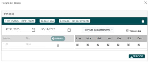 Si tu centro va a estar cerrado durante un periodo de tiempo (ya sea por temporada o por mantenimiento), puedes configurarlo en el sistema siguiendo estos pasos.