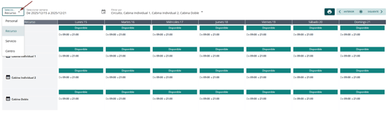 Accede a Agenda > Calendario, selecciona en la parte superior la vista de Recurso para acceder al horario de los servicios con la semana en curso seleccionada y haz clic en el día y el servicio al que necesites sobrescribir el horario.