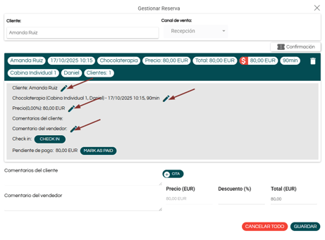 Para modificar una reserva existente en la Agenda, haz clic sobre ella y se abrirá automáticamente la ventana para gestionar sus detalles.