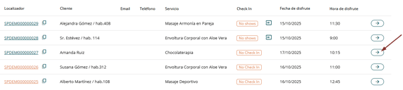 Para modificar o añadir información a una reserva ya existente en la Agenda, dirígete a Listados > Citas, localiza la reserva que deseas modificar y haz clic en la flecha situada al final de la fila para acceder a la confirmación: