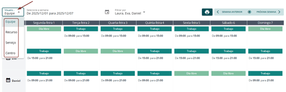 Para aceder ao Calendário, aceda ao menu lateral e selecione Agenda > Calendário. Será aberta automaticamente a vista de Equipe com a semana atual pré-selecionada, mas poderá alternar entre as vistas de Equipe, Recurso, Serviço e Centro.