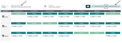Você pode navegar até uma semana específica ou avançar e retroceder entre as semanas através do menu superior. Para regressar rapidamente à semana em curso, basta clicar noindicador da Semana atual
