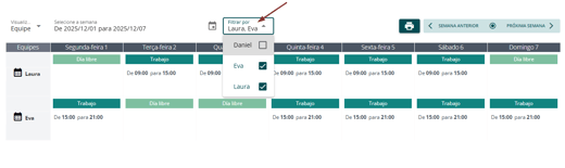 Para visualizar a agenda semanal mostrando apenas uma seleção de terapeutas, utilize o filtro situado na parte superior e desmarque aqueles que não deseja exibir.