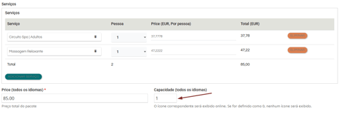 - Capacidade: Indica para quantas pessoas foi pensado o preço do pacote. Esta informação é apenas indicativa, pois a disponibilidade é definida pelos serviços incluídos.