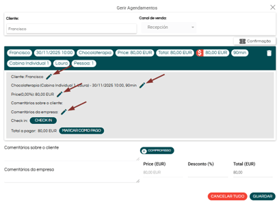 Para modificar uma reserva existente na Agenda, clique sobre ela e a janela de gestão de detalhes será aberta automaticamente.