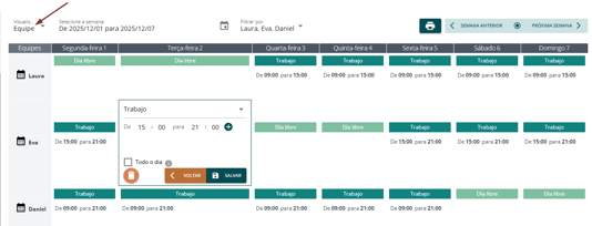Para inserir o horário dos seus terapeutas, aceda a Agenda > Calendário. Irá aceder diretamente à vista de Equipe com a semana atual selecionada.