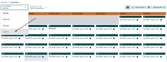 No menu lateral, vá a Agenda > Calendário e selecione a Vista: Centro.