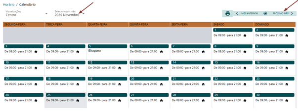 Pode mudar de mês utilizando o menu suspenso ou as setas de navegação localizadas na parte superior do calendário: