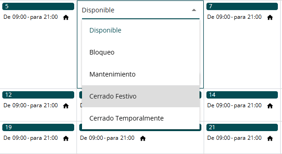 É possível definir o encerramento total de um ou mais dias específicos. Para isso, clique no menu suspenso localizado na parte superior do quadro do horário diário e selecione o motivo correspondente: